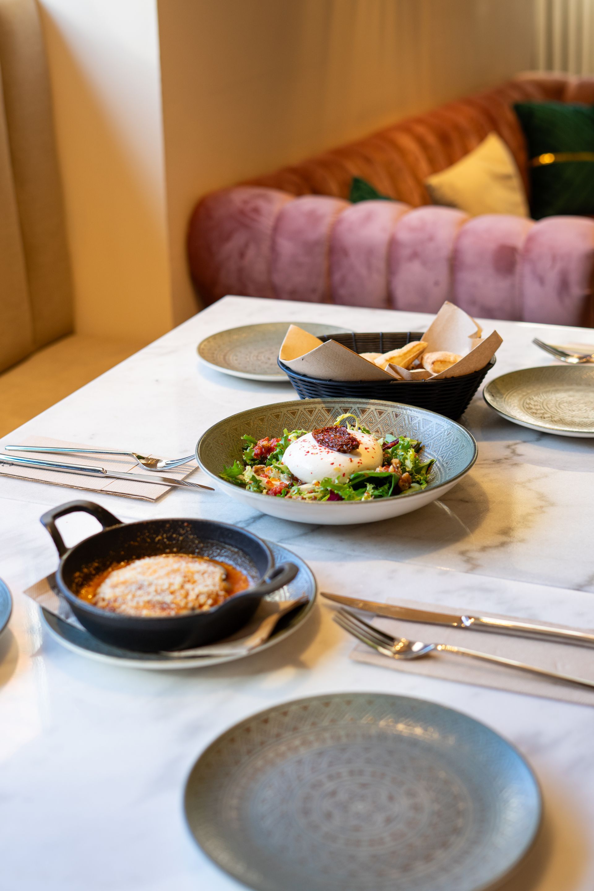 Disfruta de los colores de Italia al estilo Ineffabile, Empezado con Tomate San Marzano, Pesto Genovese y nubes de burrata DOP Puglia.